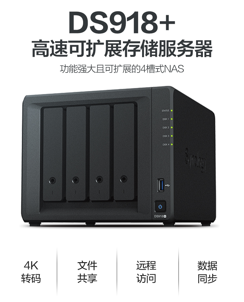 DS918+ 支持多達兩個 M.2 NVMe 2280 SSD,無需占用內部硬盤插槽即可快速創(chuàng)建系統(tǒng)緩存。DS918+ 可通過 Synology 擴充設備 DX517 擴展到多達 9 個硬盤,滿足了對靈活存儲容量的需求。