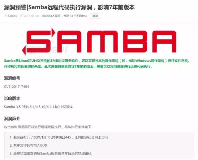 【群暉快報】2017年5月24日Samba發(fā)布了4.6.4版本,修復(fù)了一個嚴重的遠程代碼執(zhí)行漏洞,漏洞編號CVE-2017-7494。該安全漏洞可以讓一個有權(quán)限的用戶提權(quán)至Samba所在服務(wù)器的root權(quán)限,進而執(zhí)行惡意程序,向該服務(wù)器發(fā)動攻擊。